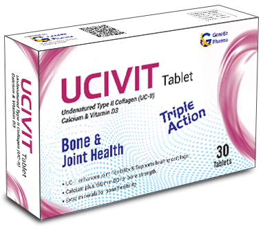 UCIVIT is a dietary supplement specially formulated to support joint health, bone strength, and overall mobility. It combines Undenatured Type II Collagen (UC-II), which helps maintain healthy cartilage and joint flexibility, with Calcium and Vitamin D3, essential nutrients that strengthen bones and improve calcium absorption. This unique combination supports joint comfort, reduces stiffness, and promotes better bone density, making it an ideal choice for individuals with joint discomfort, reduced mobility, or increased bone health needs.
